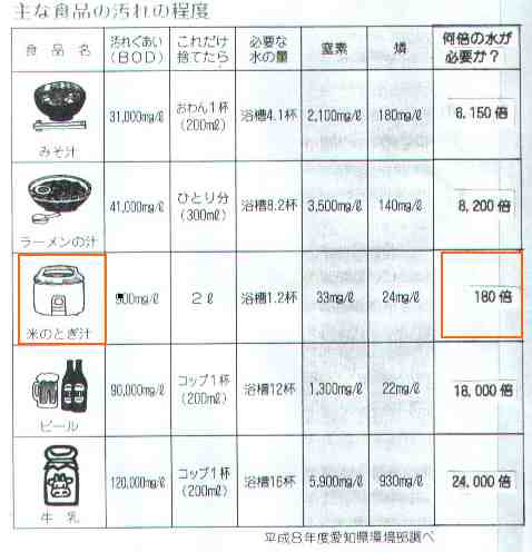 | 普段の食品でこんなに水を汚します。魚が住むためにずいぶんきれいな水が要るものですね。 | |