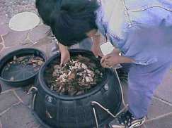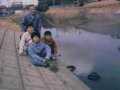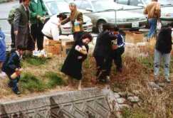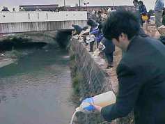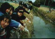| EM−Xセラミックスと落ち葉を養鰻に入れて川へ設営。赤茶の服の子が比嘉博士役の吉田哲仁君で、節子さん役が上の大石有里花ちゃんです。 | ||