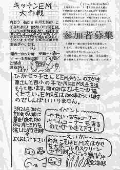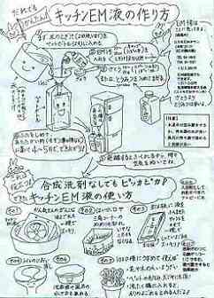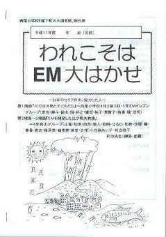 われこそEM大はかせのシナリオ![]() 小笠原先生、判治先生、児童たちが協同でシナリオを創り、全部自分たちの手作りで制作。日本初(世界初)のEM創作劇です。特にビデオ化にあたって有志児童が熱心に新しい提案をして大きく改訂した。 シナリオ希望者は西小のご厚意により先着10名までプレゼントです。 希望者は榊原まで。 | 生徒が書いたEM劇の宣伝ちらし![]() 節子さんはこの作品をたいそう喜ばれて英語バージョンにして、アメリカへ持っていくと生徒たちに約束された。 | 二の沢川キッチンEM大作戦ちらし![]() 節子さんは全国で「米のとぎ汁EM発酵液」とEMぼかし発酵堆肥を全国に広める地球環境を蘇らせる仕事をしています。 児童、くるみ会、JC、私たちが作った米のとぎ汁EM発酵液(キッチンEM液)を約3トンみんなで節子さんと共に、二の沢川浄化と三河湾浄化のために流した。特にくるみ会さんが大量にペットボトルに1,000本など2トン作った。 |