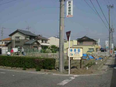 | 5月5日看板がつきました。今は止まれからの車両の見通しが悪いので位置を変えました。石崎さんの家族がいろいろ植えていました。 | ||
