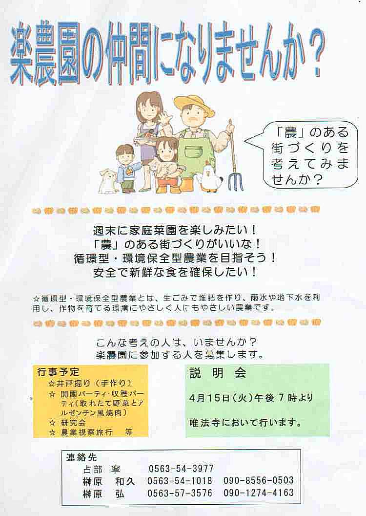 | h15.4.15 市民が個々に参画して無農薬、無化学肥料で栽培する楽農園(コミニュティガーデン)発足 | ||