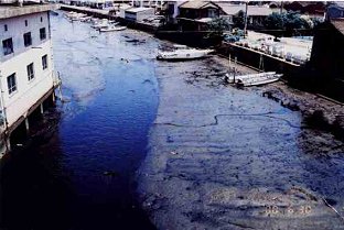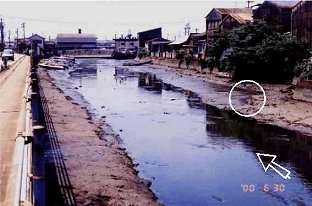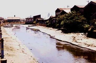 h.12.8.30水門合流点アップ(浄化後)砂底に感動 h.12.6.30 ひたすら黒いドロドロ水が流れていた