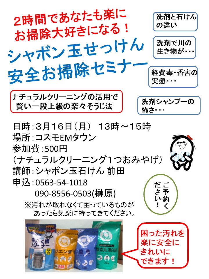 シャボン玉せっけん安全お掃除セミナーのご案内