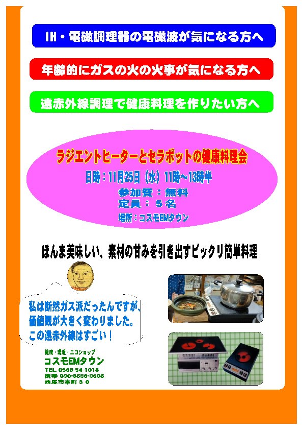 ラジエントヒーターとセラポットの健康料理会を開催します!